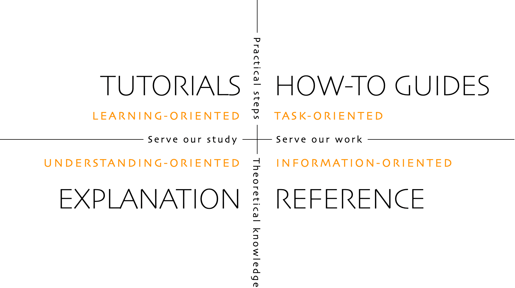 The Diátaxis framework of technical documentation authoring, aims to solve this problem, by identifiying:
